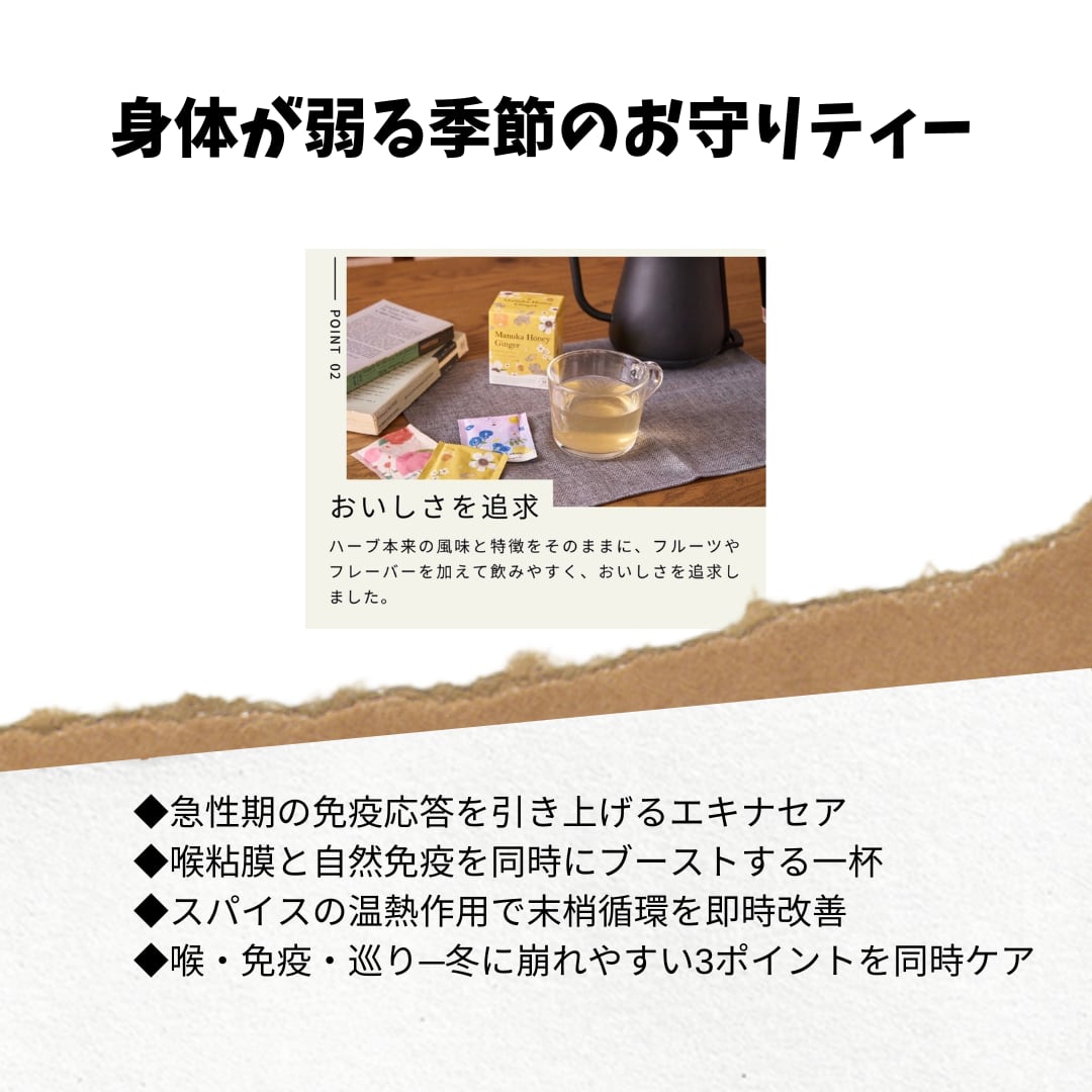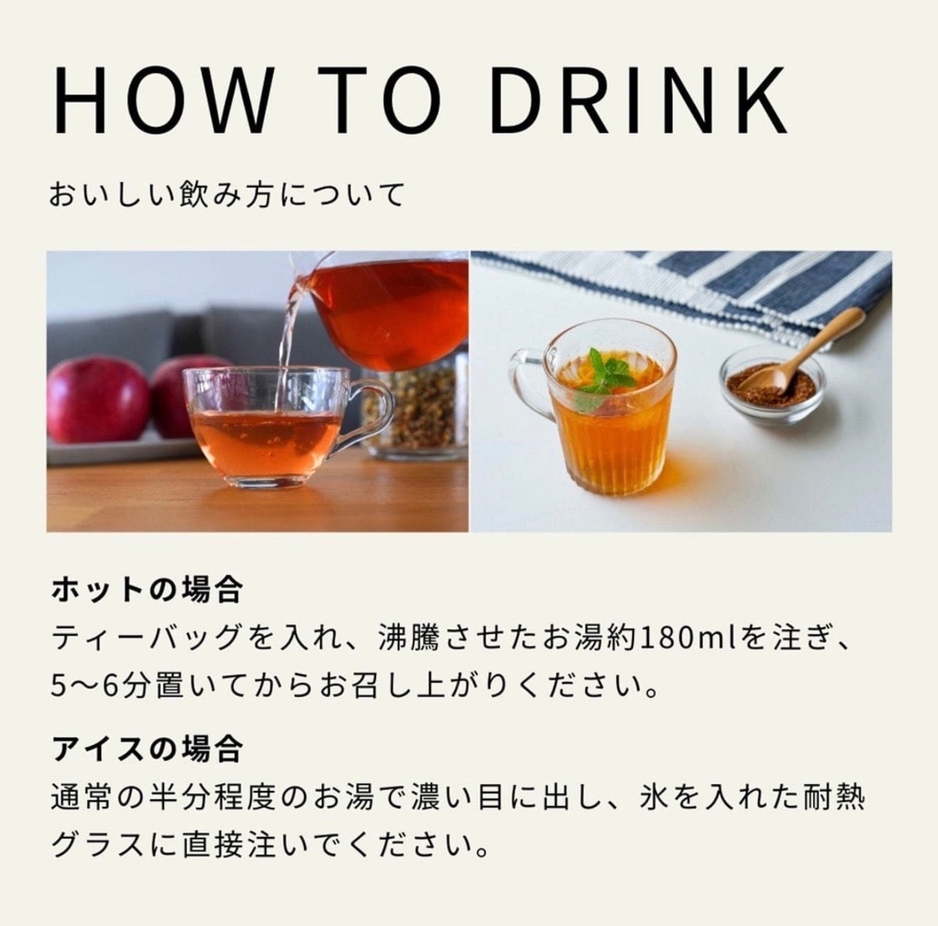 エキナセア、アップル、ローズヒップ、ブラックベリーリーフ、シナモン、ハイビスカス、ジンジャー、オレンジピール、クローブ、チコリールート/香料、クエン酸